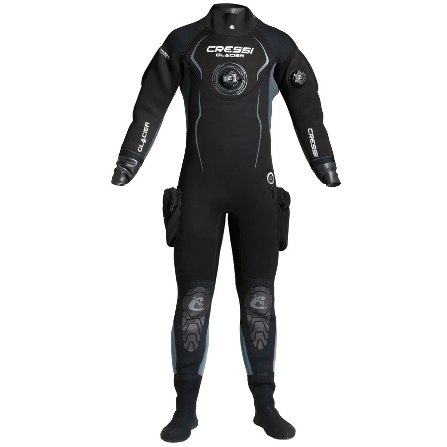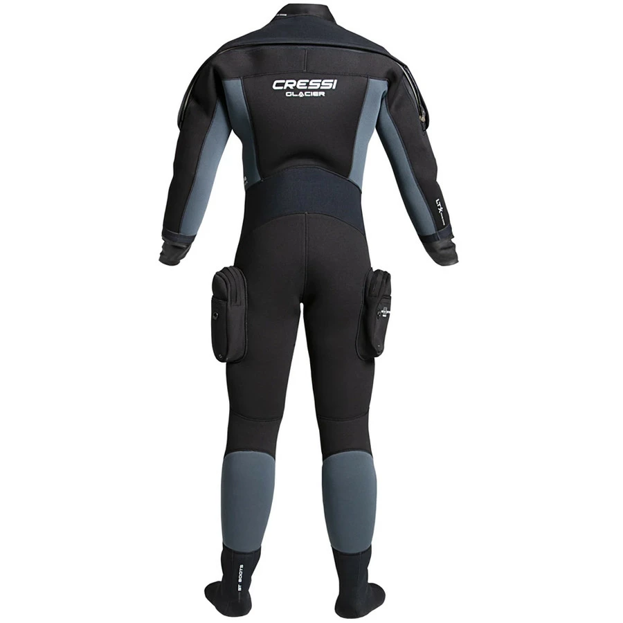 La combinaison étanche glacier est un modèle robuste en néoprène haute densité pré-compressé de 4 mm. Sa caractéristique principale est l’étanchéité au niveau du col et des poignets. Le joint est en latex. Cela garantit la meilleure adhérence possible sur votre corps, et réduit les possibilités de fuites d’eau entrant dans la combinaison. Les joints de col et des poignets sont adaptables. Vous pouvez les faire couper à votre taille précise pour une personnalisation parfaite. Le col et les poignets sont également remplaçables, en cas d’usure ou de déchirure accidentelle. La combinaison glacier dispose d’un deuxième col en néoprène de 1,5 mm, pour une meilleure protection thermique. Les épaules, le dos, les hanches et les genoux sont renforcés par un matériau de type x-diamond, qui rend cette combinaison très résistante aux abrasions. Les pieds sont en néoprène doux et élastique, offrant un ajustement parfait. À l’intérieur de la combinaison étanche, des bretelles permettent un bon maintien en place même si elle est ouverte. La glissière est munie d’un rabat en néoprène. La soupape de gonflage est activée par un bouton latéral, alors que celle de purge est réglable. La combinaison glacier dispose de deux grandes poches sur les côtés des jambes, permettant de positionner confortablement le matériel supplémentaire que vous voulez avoir avec vous sous l’eau