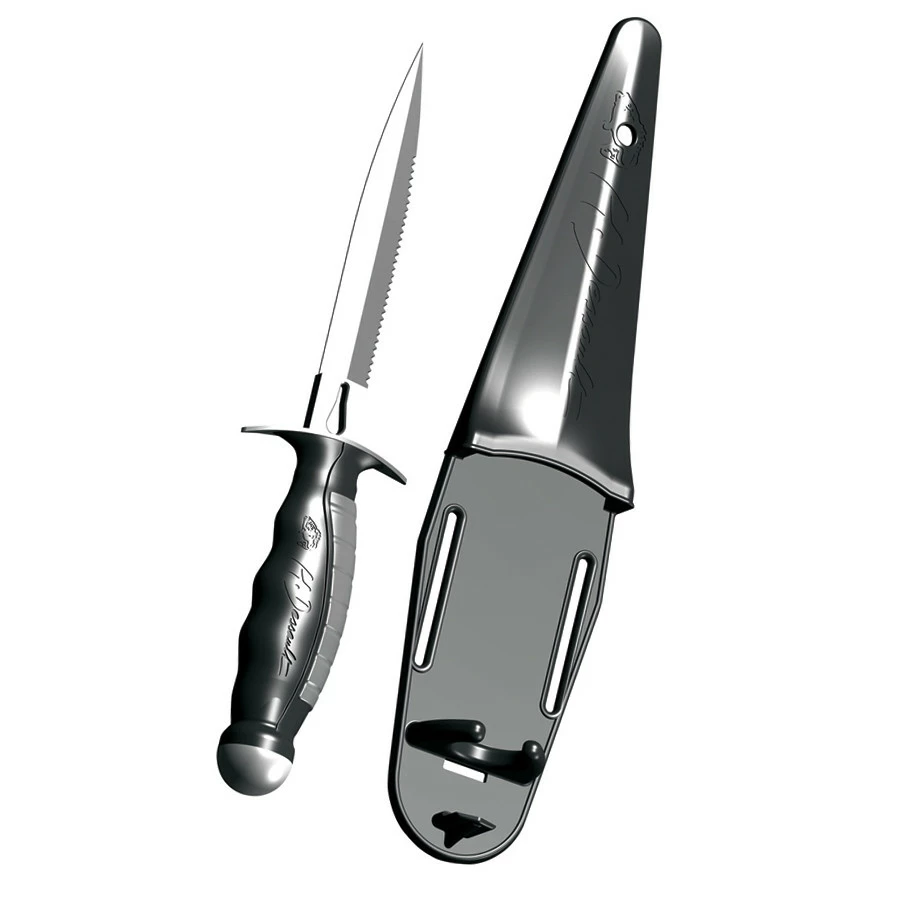 Dague de chasse sous marine, entièrement démontable, équipée d’une lame traversante de 13,6cm en inox marine.